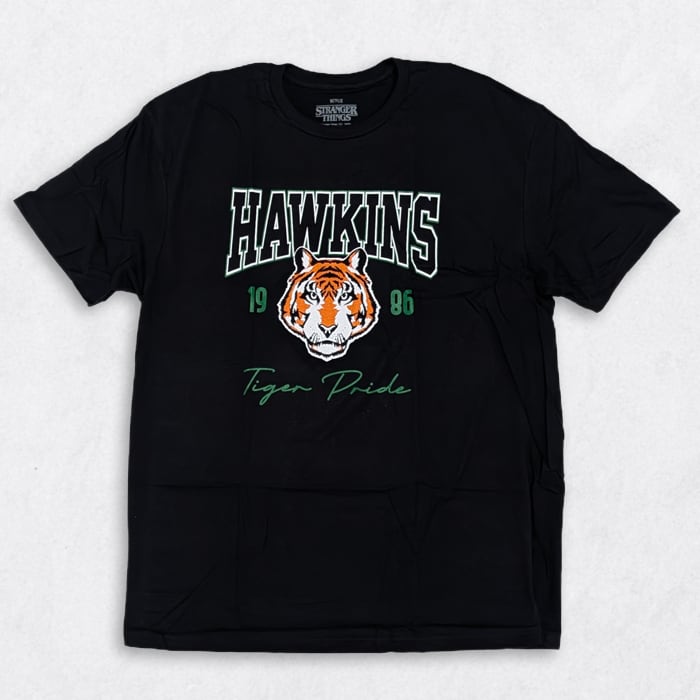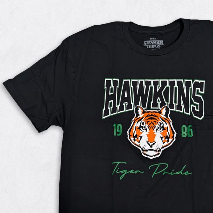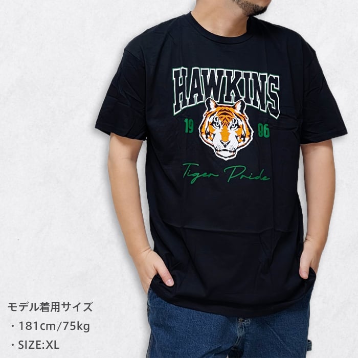 STRANGER THINGS劇中の舞台『ホーキンス高校』の体育会系スウェットを再現したデザインのカレッジTシャツはいかがでしょう。