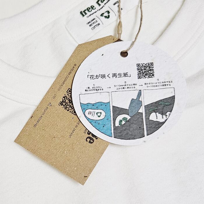 ネームタグと下げ札にもリサイクル素材が使用されており、下げ札は水に数時間浸して土に埋めると、花が咲きます。
