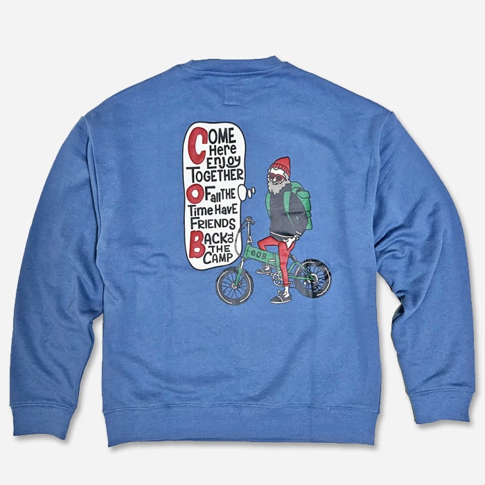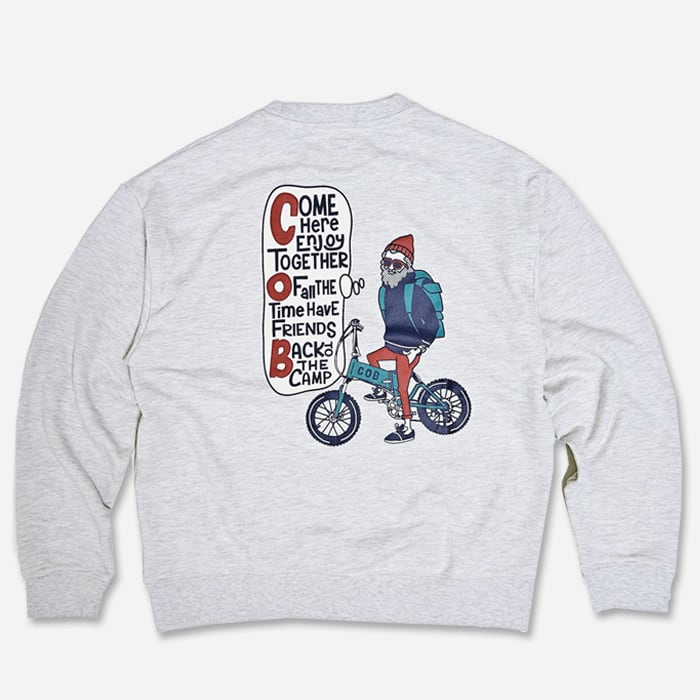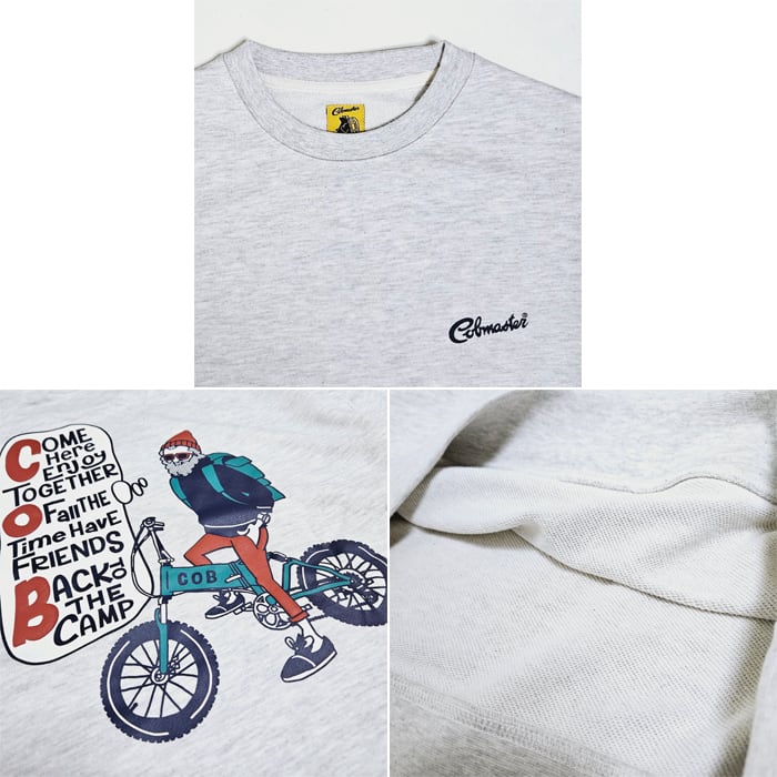 コブマスターのアイコンの一つでもあるアウトドアオジサンが自転車に乗ったバックプリントスウェット。