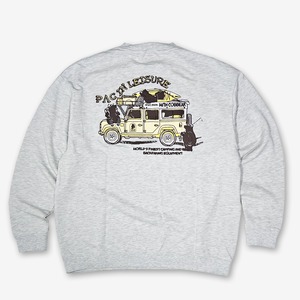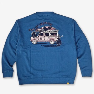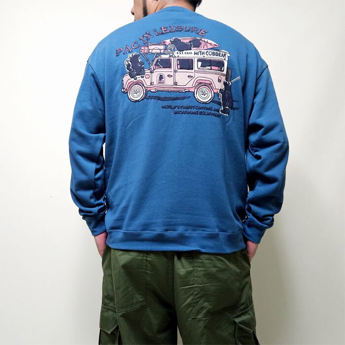 コブマスターのアイコンの一つでもあるコブベアーたちが、ブランドのオフィシャルカーに乗って、釣りやキャンプなどのレジャーに行く雰囲気が楽し気なバックプリントスウェット。