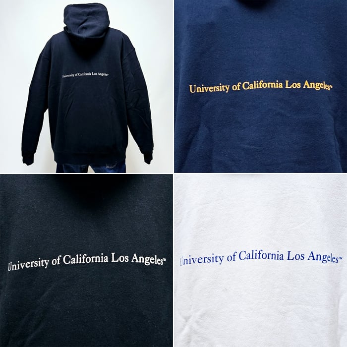 フロントはアーチロゴにエンブレムを組み合わせた定番的なカレッジグラフィック、バックにはアクセントとしてさり気なく[University of California Los Angeles]の文字をプリント。